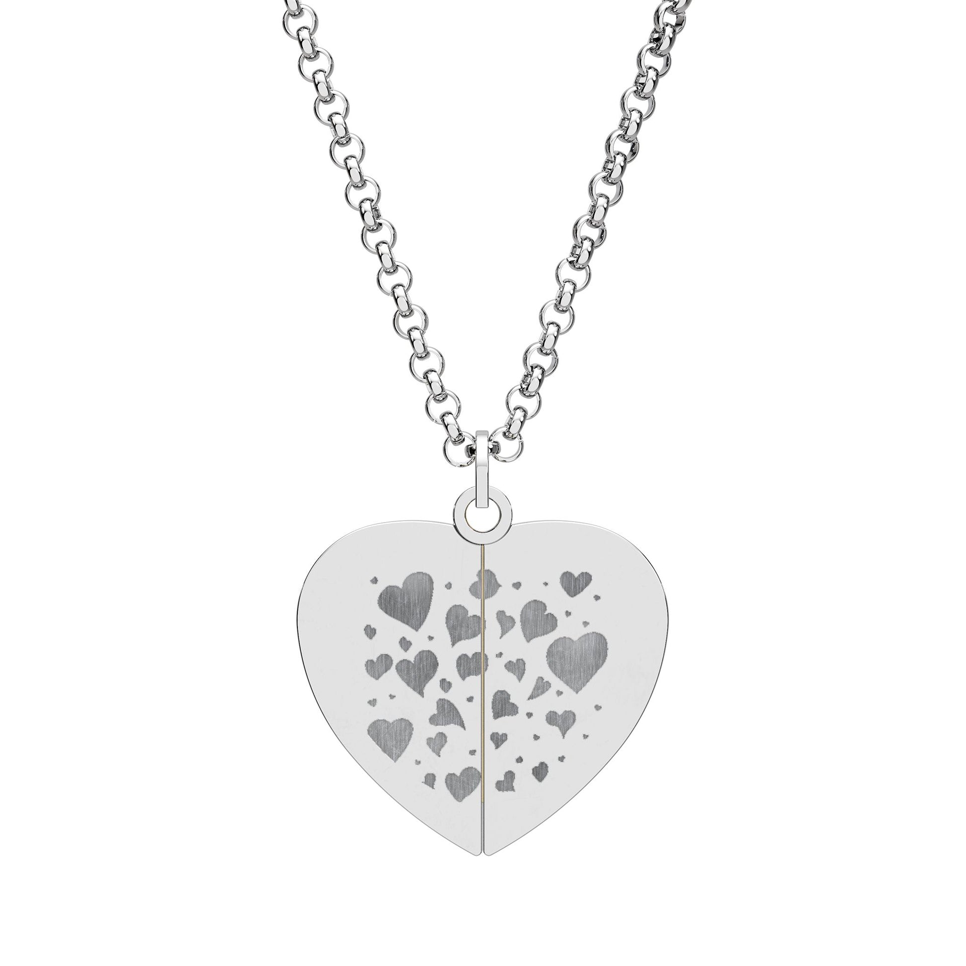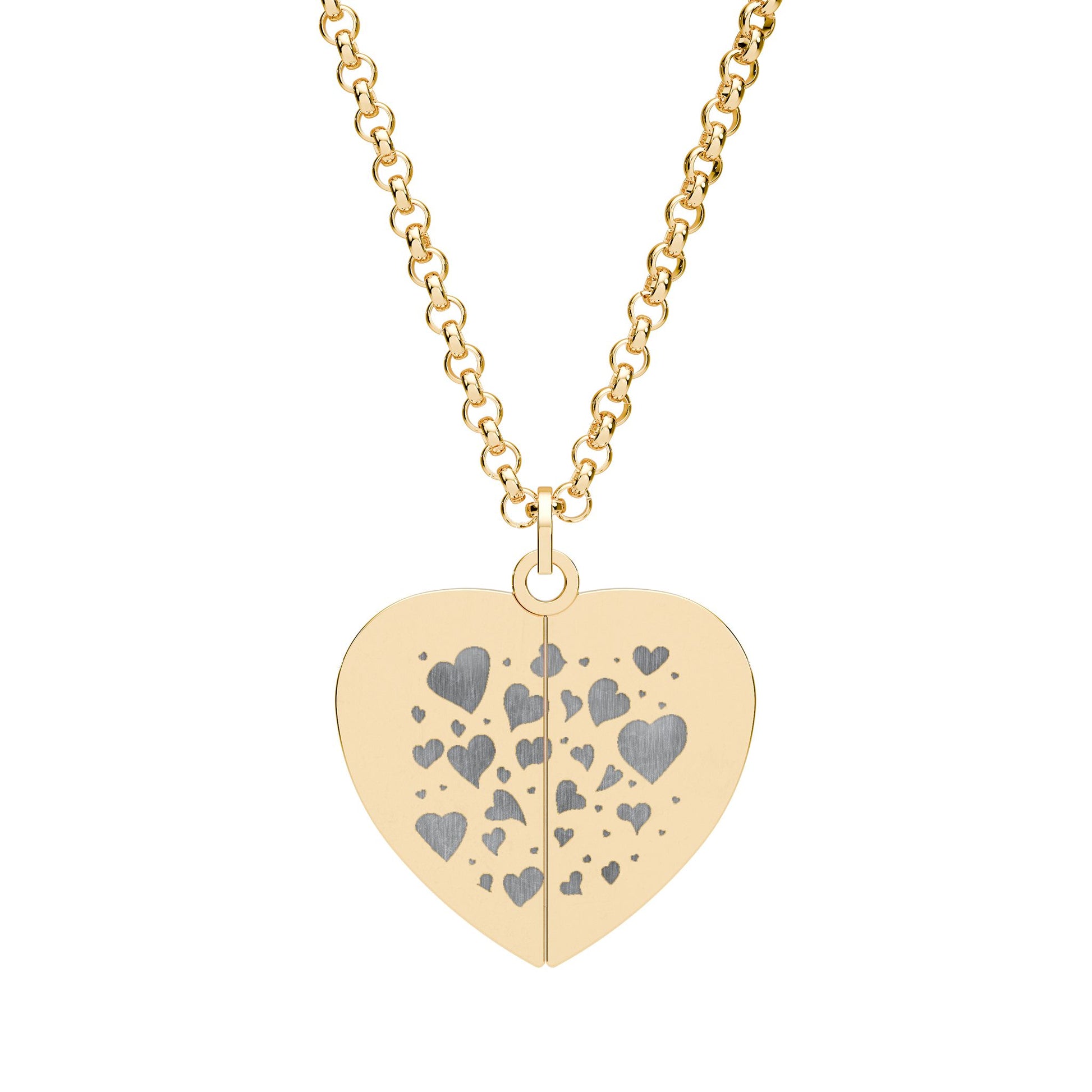 This delicate heart pendant opens to reveal a small hidden disc that can be engraved with a private name or message. Brushed stainless construction keeps the surface crisp while the 18K gold PVD-coated disc offers warm contrast when revealed. The split heart front is scattered with tiny cut or etched hearts, creating a soft, playful texture that hides a personal sentiment inside. Lightweight and hypoallergenic, it sits close to the collarbone on a short, adjustable chain — a quiet piece that carries a whispered connection from wearer to wearer.