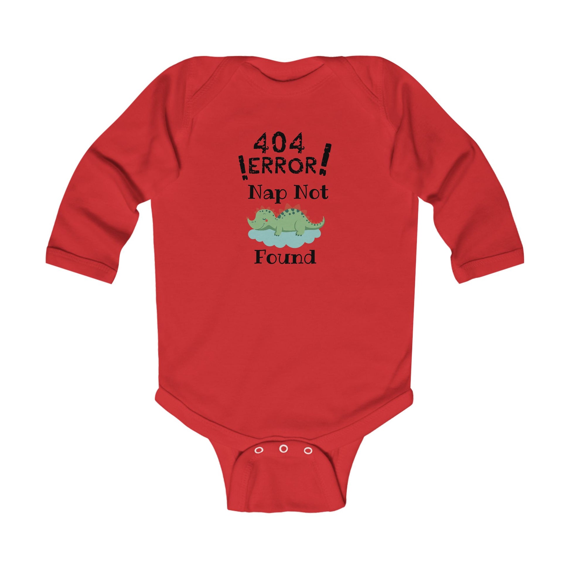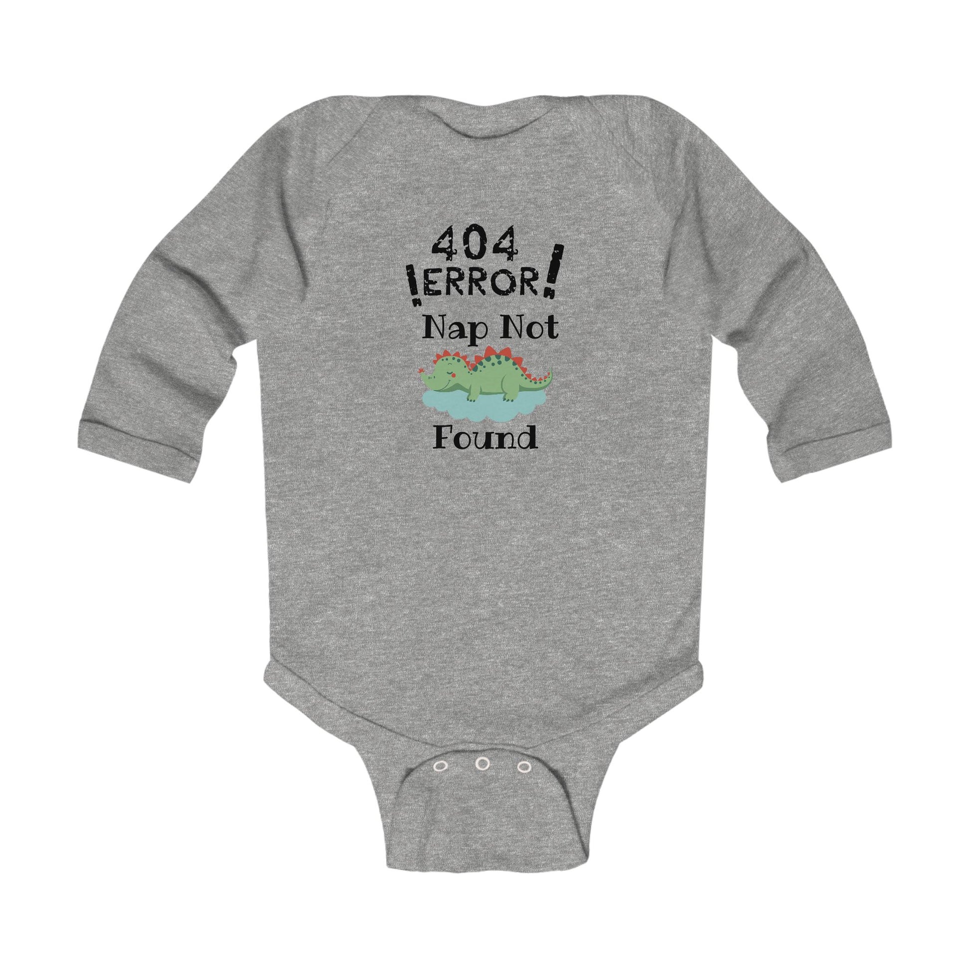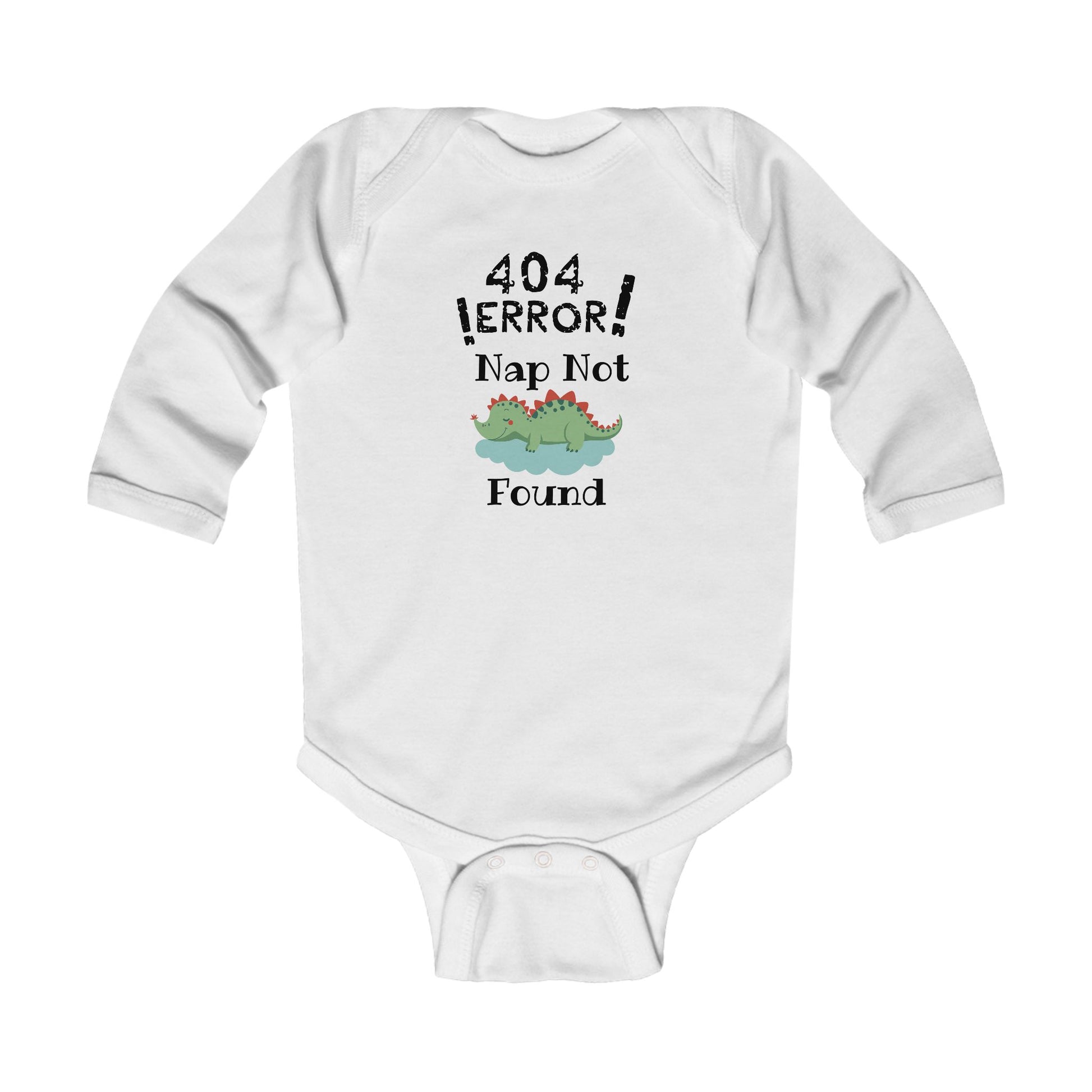 A soft, long-sleeve infant bodysuit with a playful tech-themed design: “404 ERROR! Nap Not Found” above a sleepy cartoon dinosaur. Lightweight and gentle against delicate skin, it brings a little humor to everyday routines — from sleepy mornings to fussy afternoons. The ribbed neckline and three-snap cross closure make dressing and diaper changes quick and easy, while the classic fit leaves room to wiggle and stretch. Let the tiny one wear a cheeky nod to parent-life during naps, playtime, or family visits.
