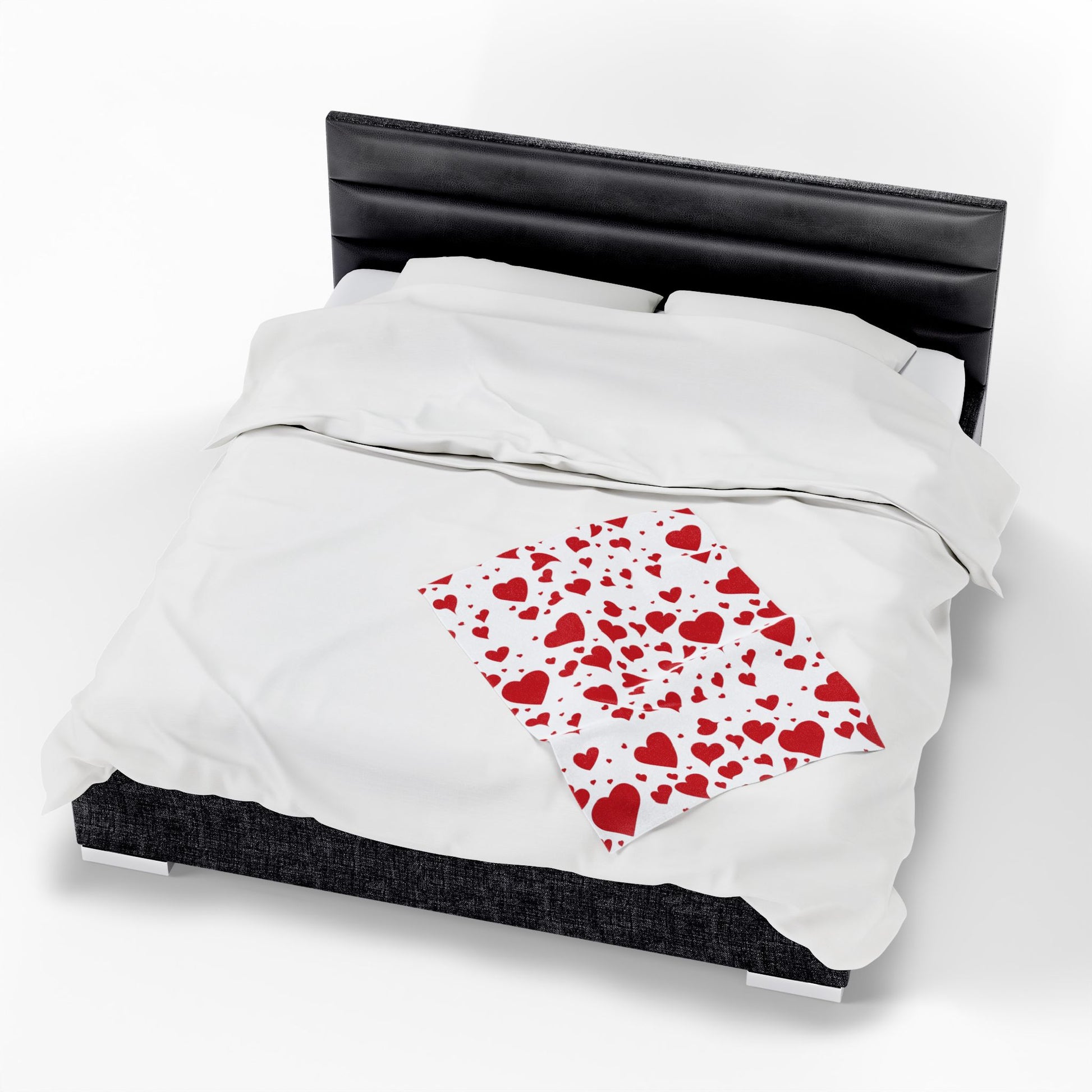 A velveteen plush blanket patterned with scattered red hearts on a clean white field. The fabric feels sumptuously soft and holds vibrant color on one printed side, wrapping you in warmth and a gentle, cozy weight. It drapes easily across a couch, bed, or lap—bringing a playful, affectionate mood to quiet evenings, movie nights, or slow mornings with coffee. The stitched edges add durability so this blanket can be reached for again and again, season after season. It’s the kind of throw that invites cuddles, lends a touch of romance to everyday spaces, and brightens the room without shouting.